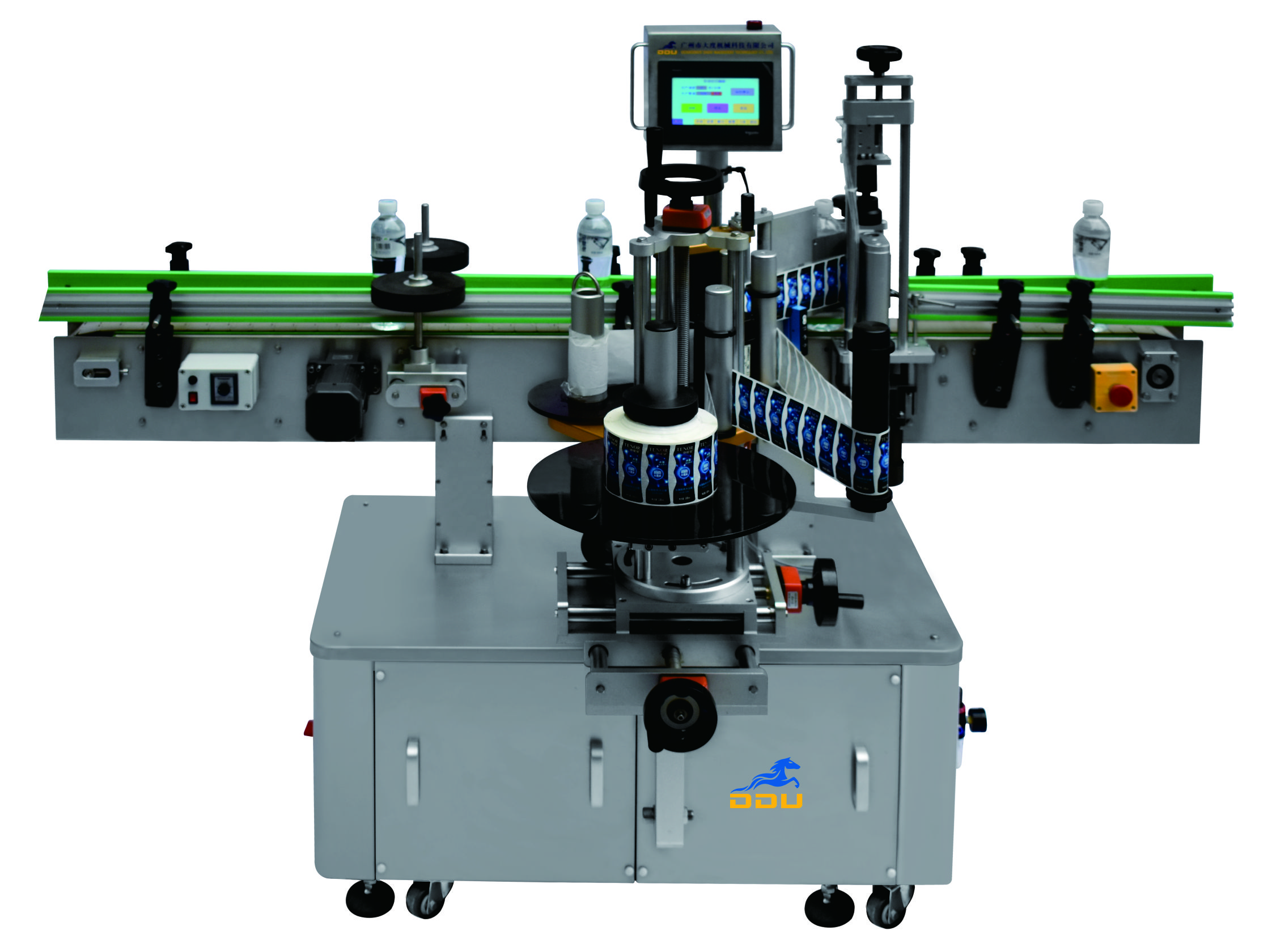DDU-1603 立式圓瓶定位貼標(biāo)機(jī) 適用范圍:用途廣泛!主要適用于醫(yī)藥、日化、食品等行業(yè)的圓柱形包裝容器或小錐度的圓錐形包裝容器的單標(biāo)、雙標(biāo)自動(dòng)定位貼標(biāo).該機(jī)拓展性強(qiáng)!可選配各類打印機(jī)完成在線實(shí)時(shí)打印,可單機(jī)使用,亦能連接生產(chǎn)線使用 主要性能結(jié)構(gòu)特點(diǎn):1、中英文觸…